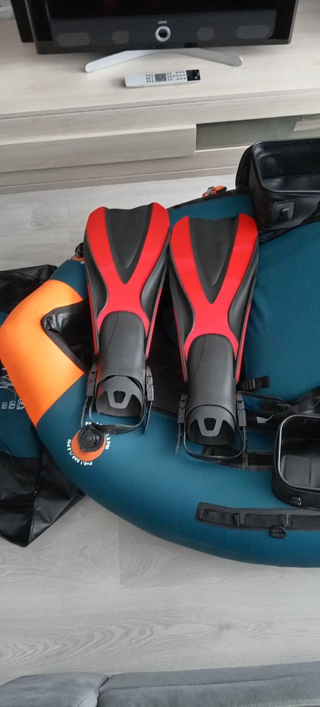 Pato de pesca tipo belly boat con respaldo acolchado, múltiples compartimentos. Muy estable y cómodo.