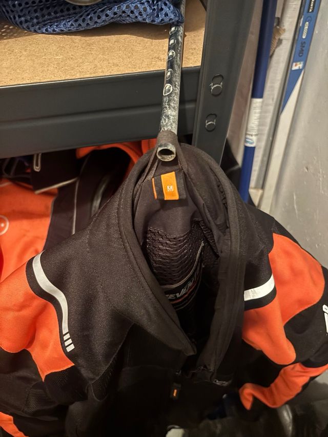 Equipo de moto en color naranja y negro, talla M. - Etiqueta de talla M visible. - Cierre de cremallera.
