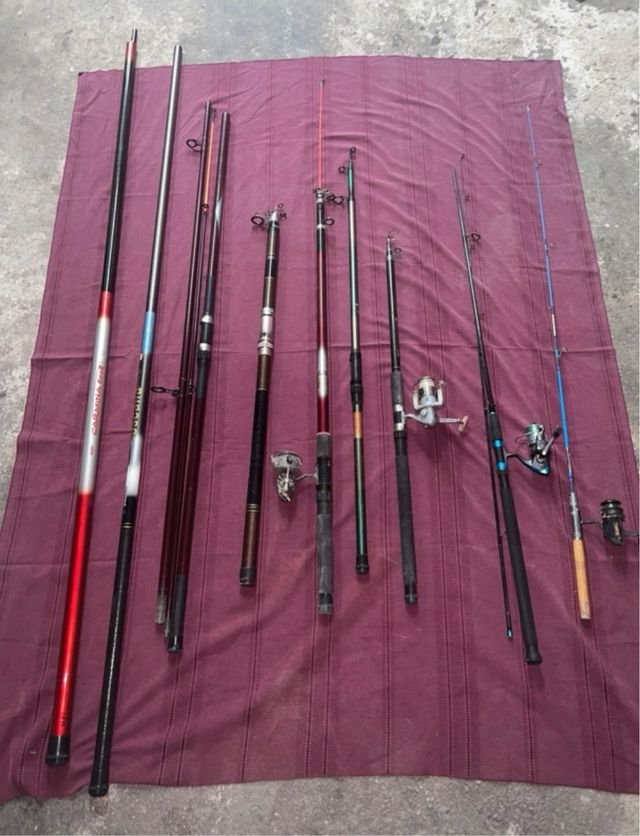 Cañas de rapalear 8m y 6 Cañas 5m 4,5m y 2m Carretes y soportes Hilo Caja con pesas, anzuelos.. y funda mochila para cañas. señuelos.. .