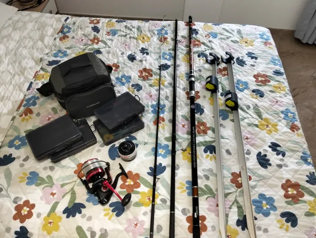 Detalles del productoEquipo completo de surf casting.caña vega hellon GTr,420.anillas fuyi..carrete.cinetic.7000.con 2 vovinas.dos pinchos .1 bolsa .4 cajas .con.plomos anzuelos jiratios nailos fluro carbono tijeras alicates . completo para pescar todo como nuevo... Huelva capital
