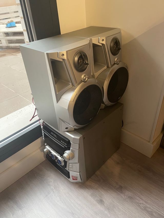 Equipo de sonido con lector de CD, radio, cinta y auxiliar. No incluye mando.