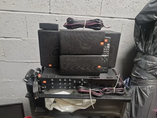 Sistema de sonido JBL en color negro. Incluye altavoces y amplificador.