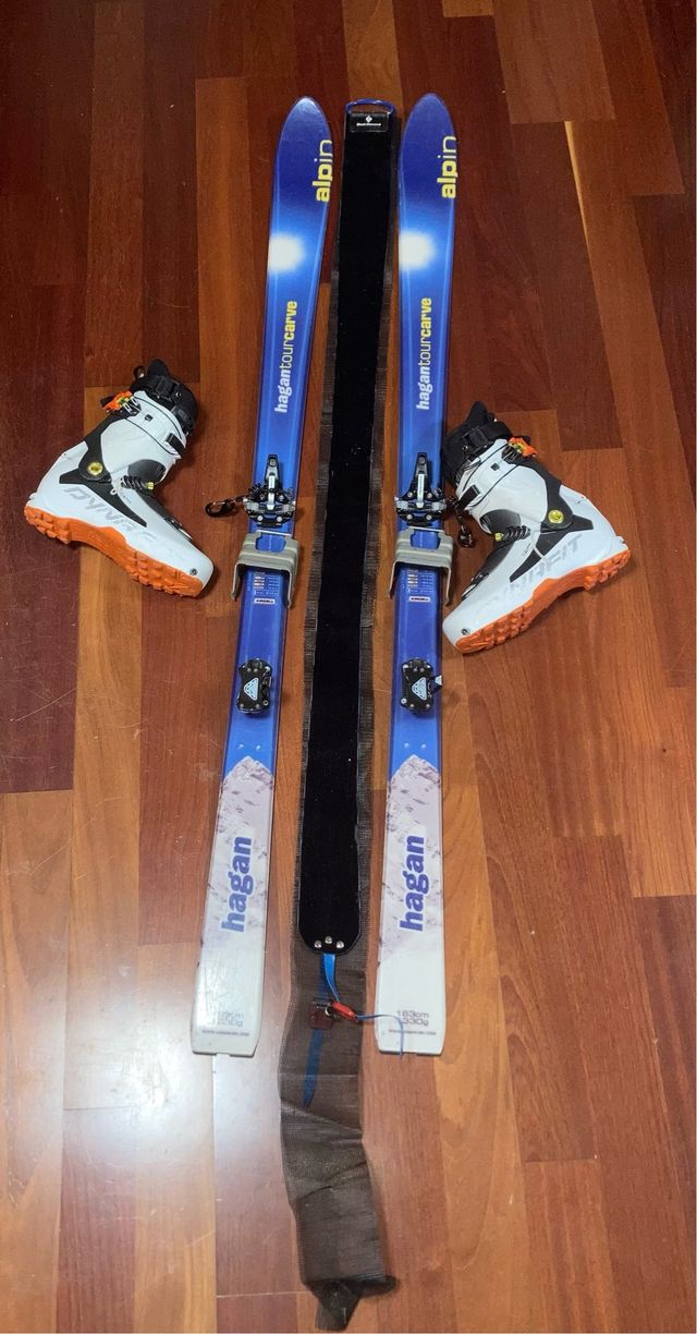 fijaciones con 4 usos compradas en enero 2025 Dynafit Speed turn. tablas hagan tour carve 163 cm, 1,330kg, cotas tip 107mm, waist 71mm, tail 94mm, radio17,4m. focas black diamond.