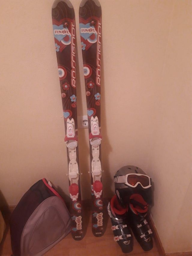 Detalles del productoConjunto completo de esquí junior, ideal para iniciarse en este deporte. Incluye esquís, botas, casco y gafas.