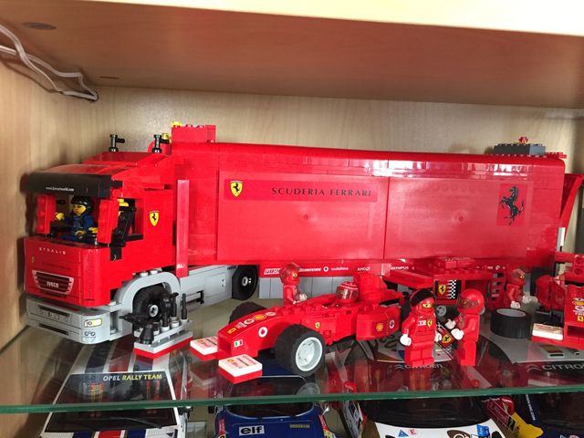 Camión, coches , boxes, semáforo de meta y podio del equipo Ferrari f1 de lego, en perfecto estado y en vitrina