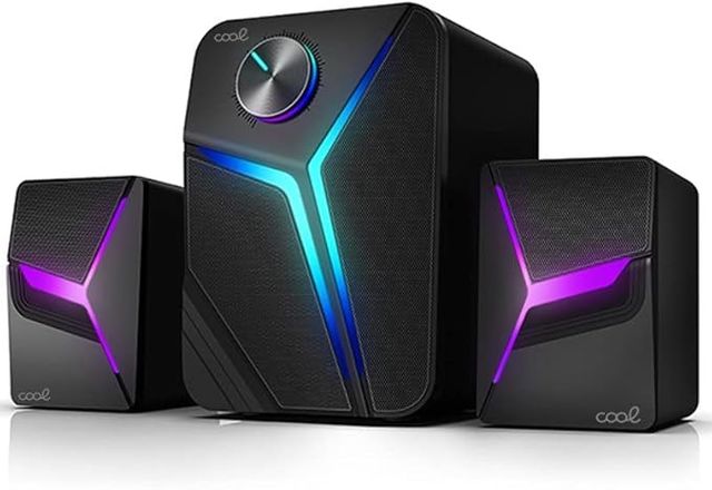 Equipo de sonido para PC con iluminación LED. - Diseño moderno con luces LED azules y moradas. - Conexión USB. - Potencia de 13W.