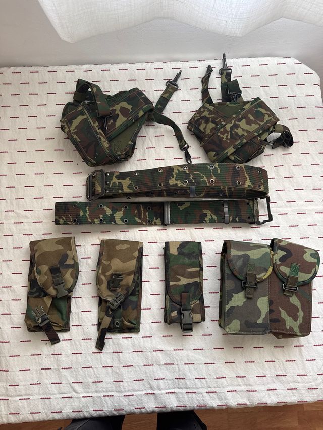 Detalles del productoConjunto de equipo táctico con estampado de camuflaje, ideal para actividades al aire libre como paintball o airsoft. Ejército o militar.