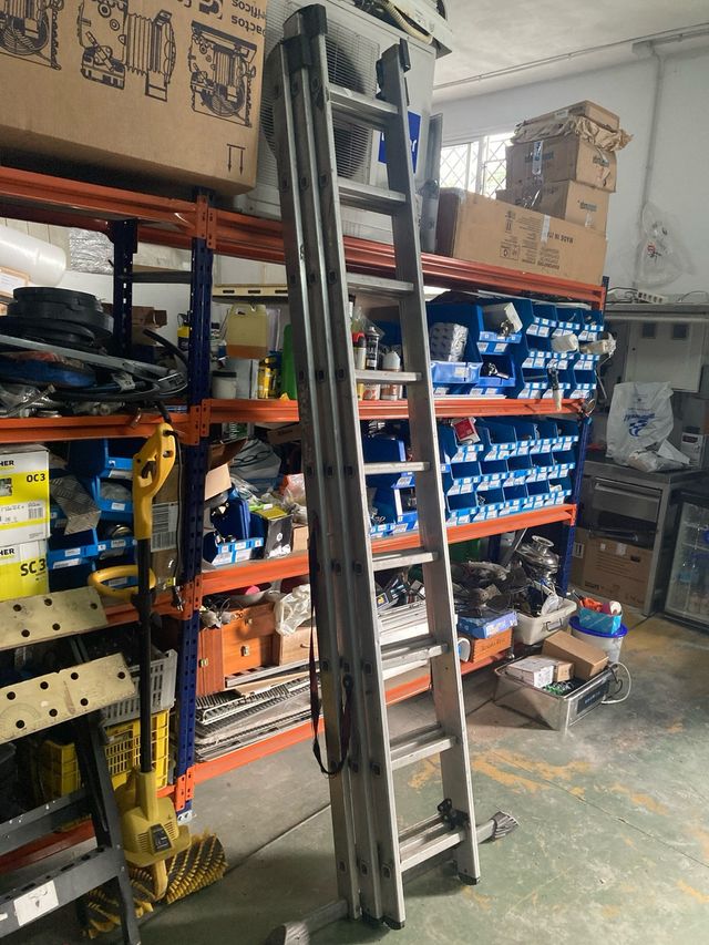 Escalera larga de aluminio con tres tramos y nueve peldaños. - Material: Aluminio. - Número de tramos: 3. - Número de peldaños por tramo: 9.
