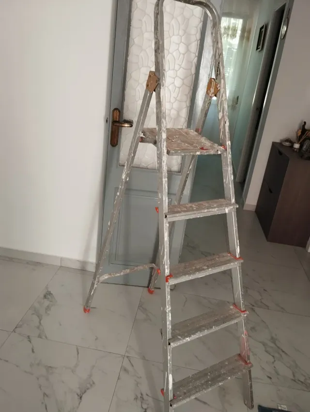 Escalera de aluminio con 5 peldaños. - Ideal para trabajos en casa o en el jardín. - Diseño plegable para un fácil almacenamiento. - Peldaños antideslizantes para mayor seguridad.