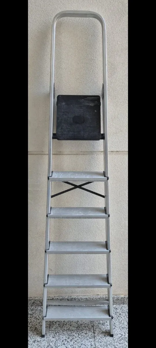 Detalles del productoEscalera 6 peldaños marca habitek plegable de aluminio, ideal para tener en casa o en el garaje. Es ligera y fácil de guardar pvp no negociable