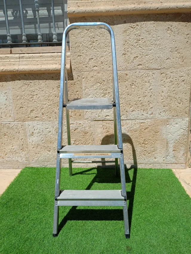 Escalera de aluminio con tres peldaños, ideal para tener en casa o en el taller.