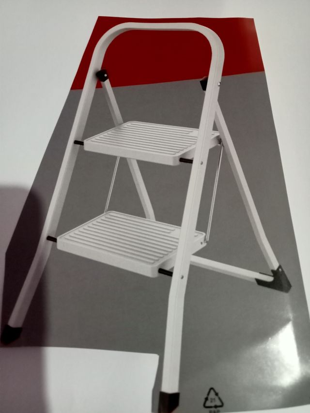 Detalles del productoEscalera plegable de dos peldaños en color blanco. Se encuentra nueva y en su embalaje original.