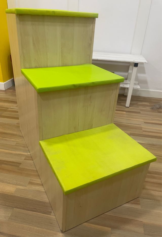 Escalera de madera con peldaños de color verde brillante. - Tres niveles de altura. - Diseño moderno y funcional. - Ideal para mascotas y acceder a zonas elevadas.