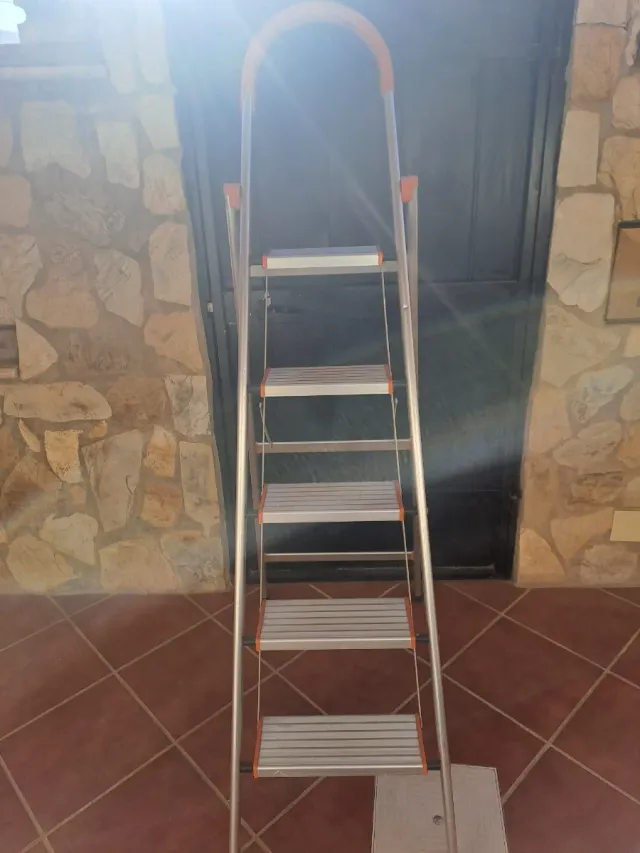Escalera de aluminio con peldaños antideslizantes. Es plegable y fácil de guardar. - Material: Aluminio - Diseño plegable - Peldaños con superficie antideslizante