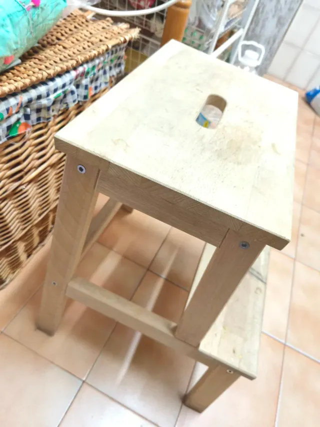 Escalera de madera de dos peldaños. Es práctica y fácil de usar. - Material: Madera - Diseño: Dos peldaños - Asa para transporte