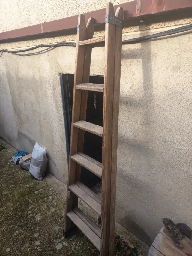 Escalera de madera de varios peldaños. - Construcción robusta. - Ideal para trabajos en altura.