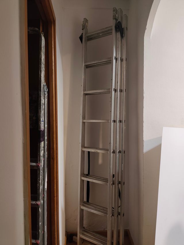 Escalera de montaje en muy buen estado, ideal para trabajos en altura. Fabricada en aluminio resistente. - Material: Aluminio - Tipo: Escalera de montaje