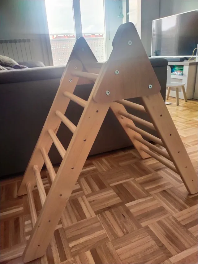 Escalera de juego triangular de madera para niños, inspirada en la pedagogía Montessori. Fomenta el desarrollo motor y la exploración.