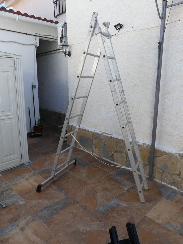 Detalles del productoEscalera de aluminio de dos cuerpos, ideal para trabajos en altura. En posición de tijera ofrece una altura de 2 metros hasta la cruz. En extensión máxima ofrece una longitid de 3.2 metros (12 peldaños). Base de soporte muy estable de 95cms de ancho.