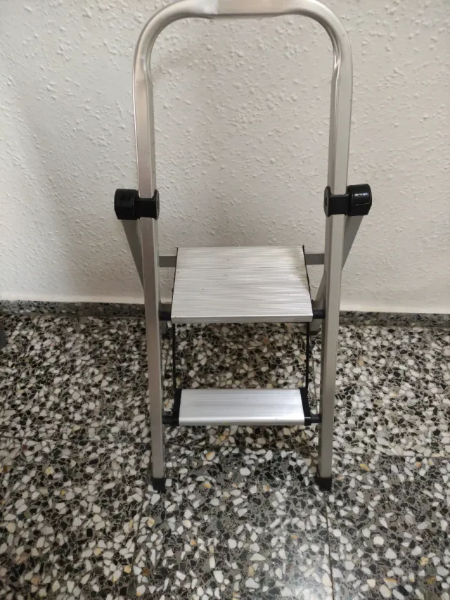 Práctica escalera de aluminio, ideal para tener en casa. - Diseño plegable para fácil almacenamiento. - Fabricada en aluminio ligero y resistente. - Dos peldaños antideslizantes.