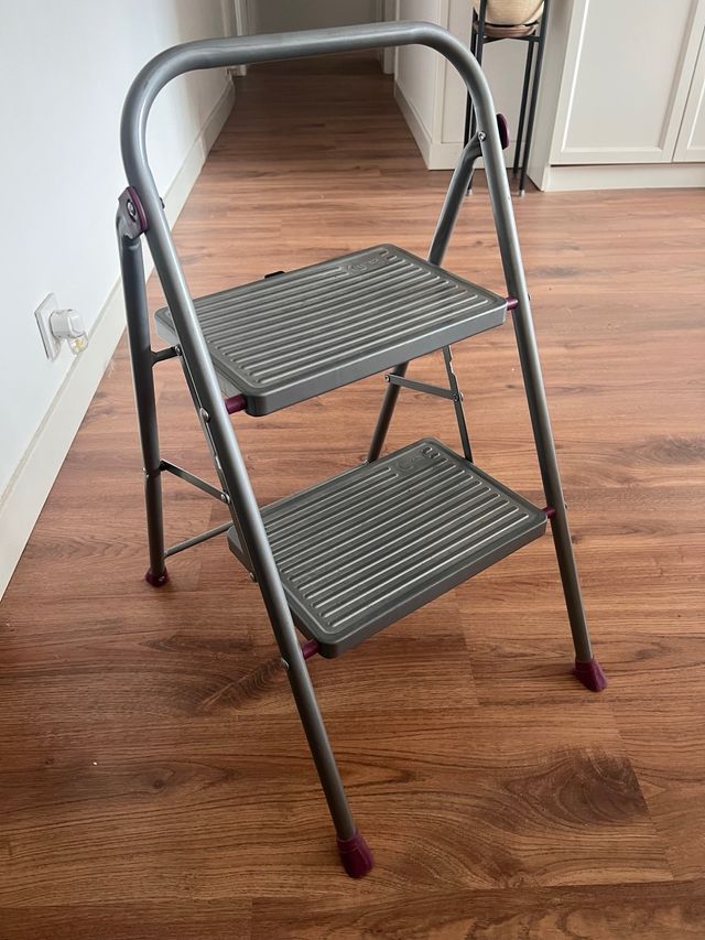 Escalera plegable de dos peldaños, ideal para tener en casa. - Estructura metálica. - Peldaños antideslizantes. - Diseño compacto para almacenar.