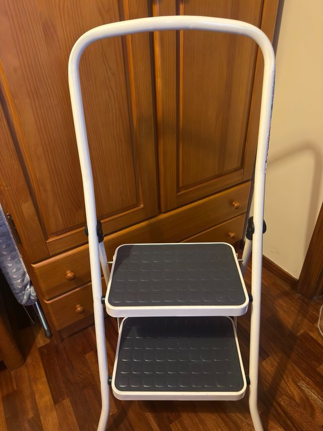 Escalera plegable de dos peldaños, ideal para tener en casa. - Estructura metálica blanca. - Peldaños con superficie antideslizante en color gris oscuro.