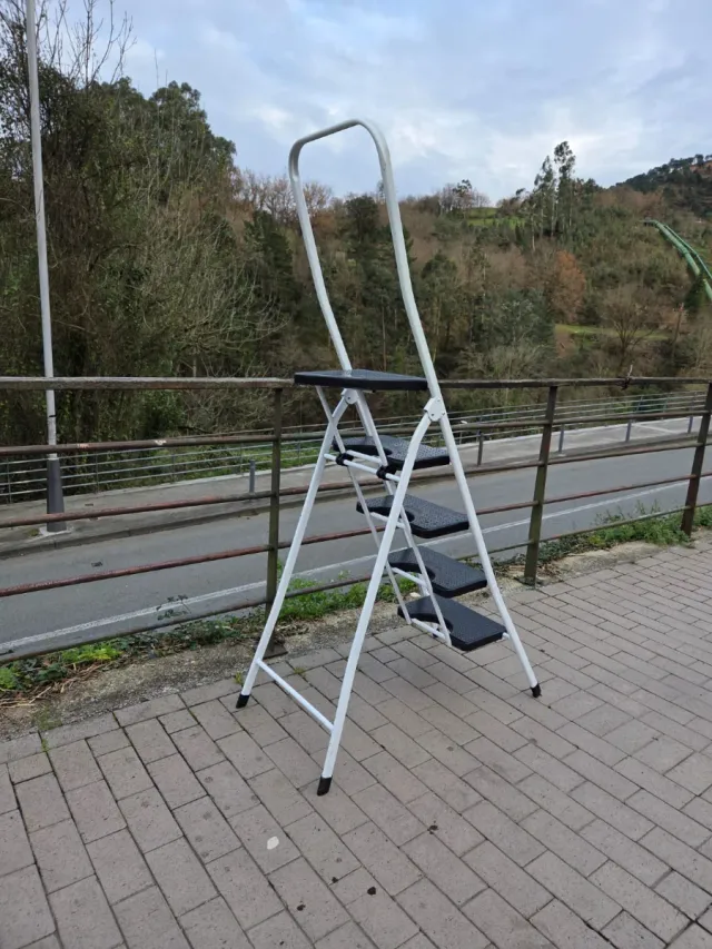 Escalera plegable de cuatro peldaños, ideal para tener en casa. - Estructura de metal blanco. - Peldaños antideslizantes negros. - Asa de seguridad superior.