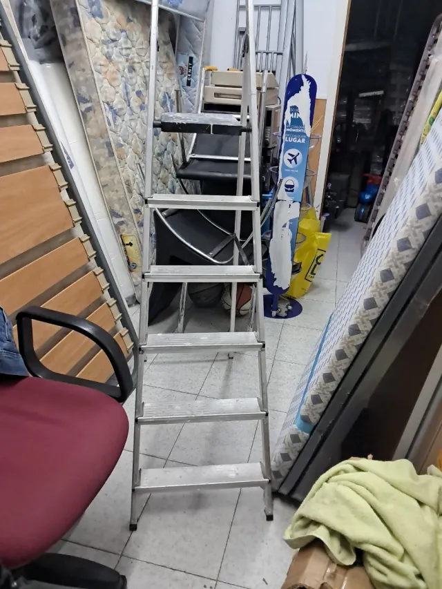 Escalera de aluminio con varios peldaños, ideal para tener en casa o en el taller. - Estructura de aluminio. - Diseño plegable para fácil almacenamiento. - Peldaños antideslizantes.