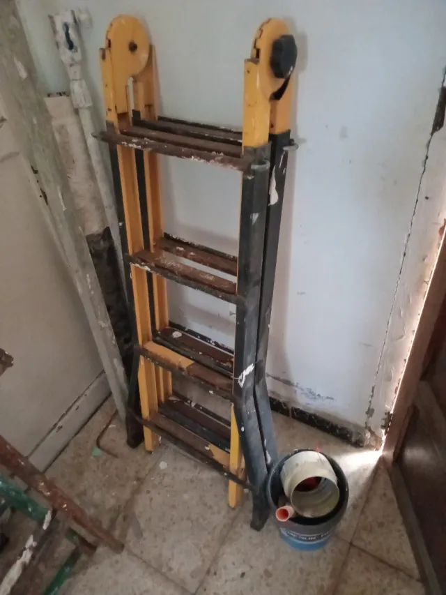 Detalles del productoEscalera plegable de color amarillo y negro, ideal para trabajos en casa o profesionales. Se pliega fácilmente para su almacenamiento.
