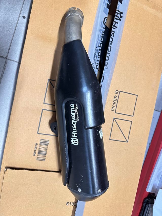 Escape para Husqvarna Svartpilen 125. - Color negro. - Logo de Husqvarna Motorcycles.