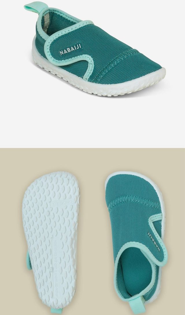 Escarpines de la marca Nabaiji para niño en talla 24-25. Perfectos para la playa o la piscina. - Color verde agua. - Cierre de velcro. - Suela antideslizante.