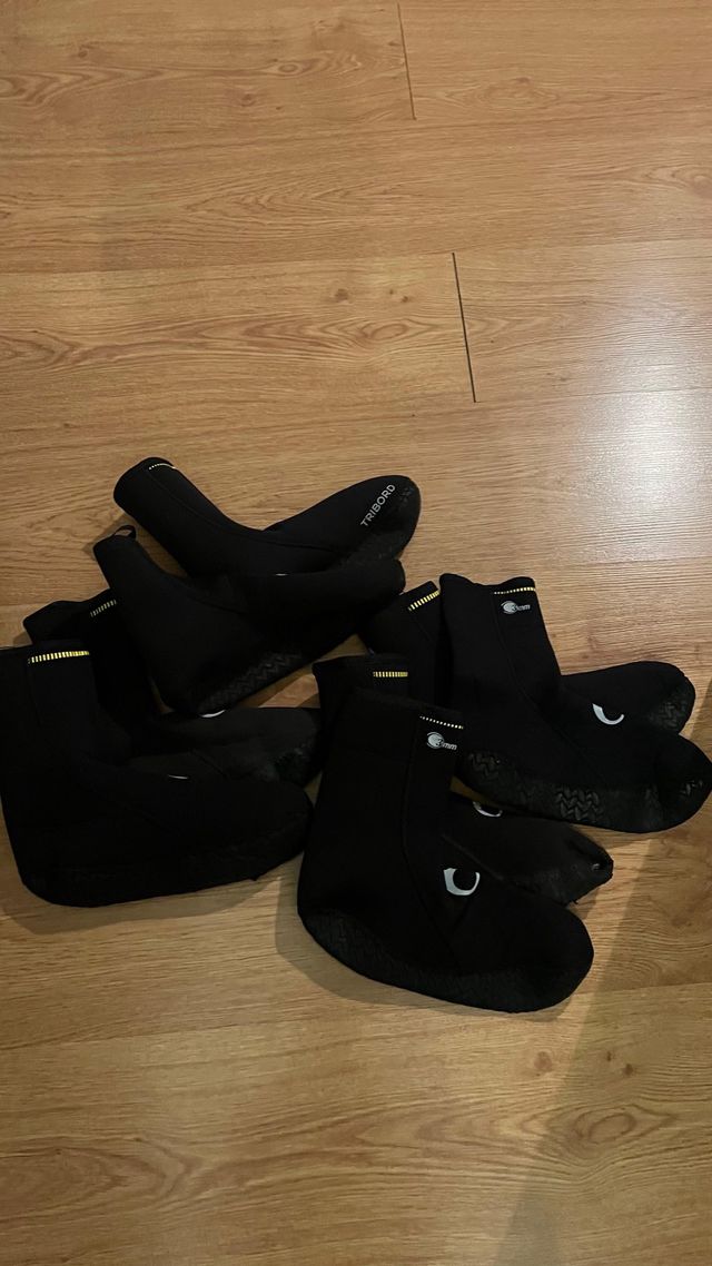 Detalles del productoSe venden escarpines de neopreno de la marca Tribord. Son ideales para la playa o actividades acuáticas. Se incluyen cuatro pares en total. Están en buen estado, listos para usar.