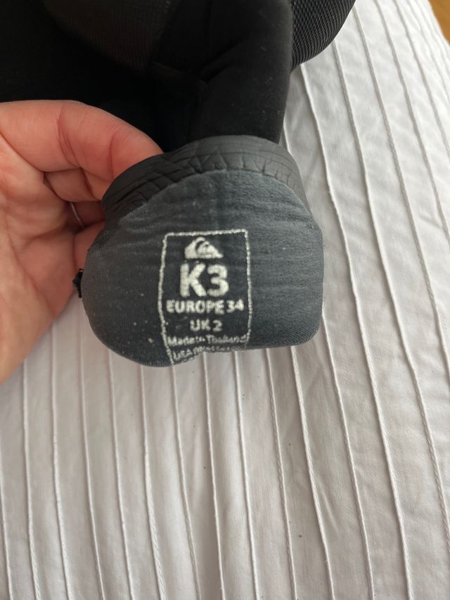 Escarpines de neopreno Quiksilver para niño. - Modelo K3. - Grosor de 5mm. - Talla EUROPE 34 / UK 2. - Fabricados en Tailandia.