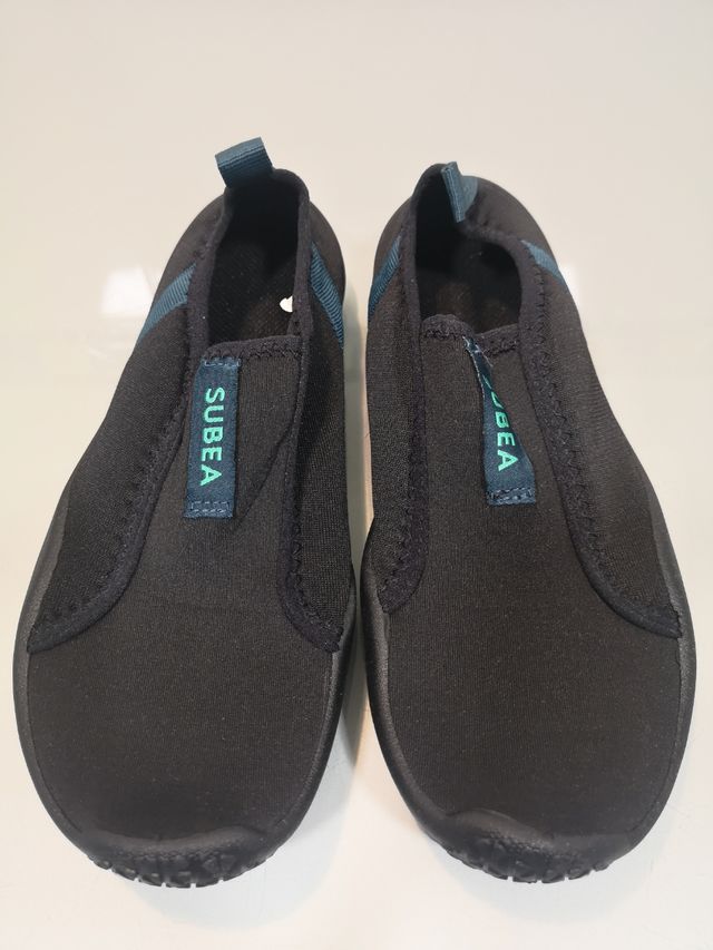 Detalles del productoZapatillas de neopreno Subea, ideales para actividades acuáticas. Son negras con detalles en verde azulado.