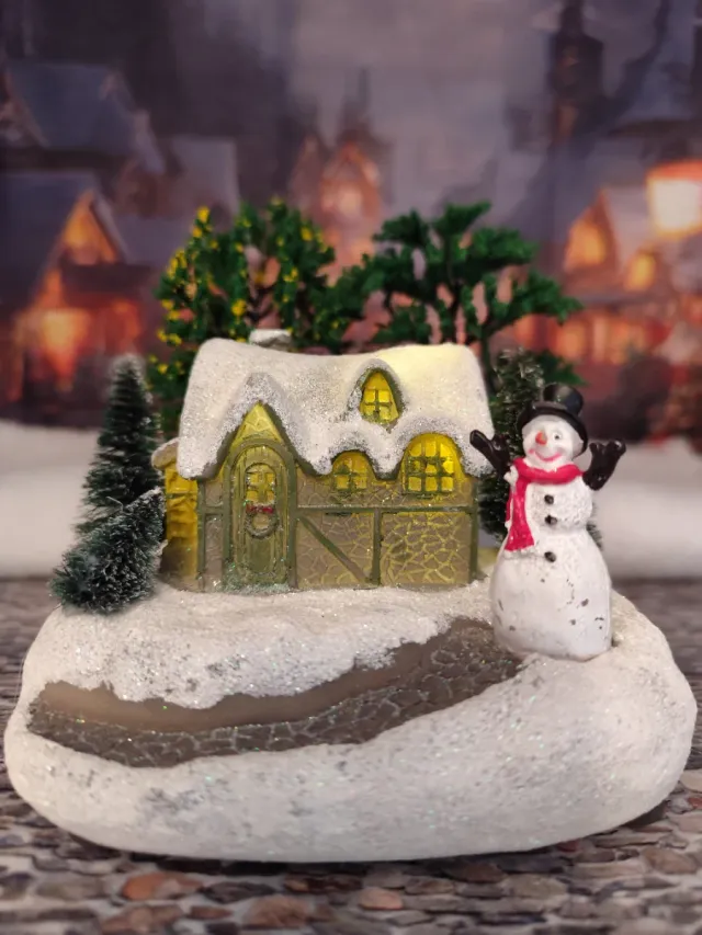 Detalles del productoAdorno navideño de una acogedora casa nevada con un simpático muñeco de nieve.