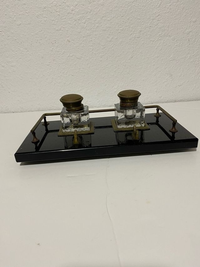 Escribanía de cristal con dos tinteros con base en marmol negro. Los tinteros tienen dos esquinas golpeadas