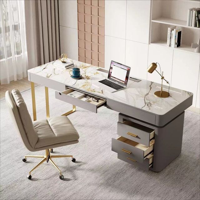 Detalles del productoEscritorio de oficina de estilo moderno y minimalista con tablero de piedra Katá dorado, armario lacado en gris con regleta incorporada y cajonera auxiliar, modelo MF-10, 1.6M