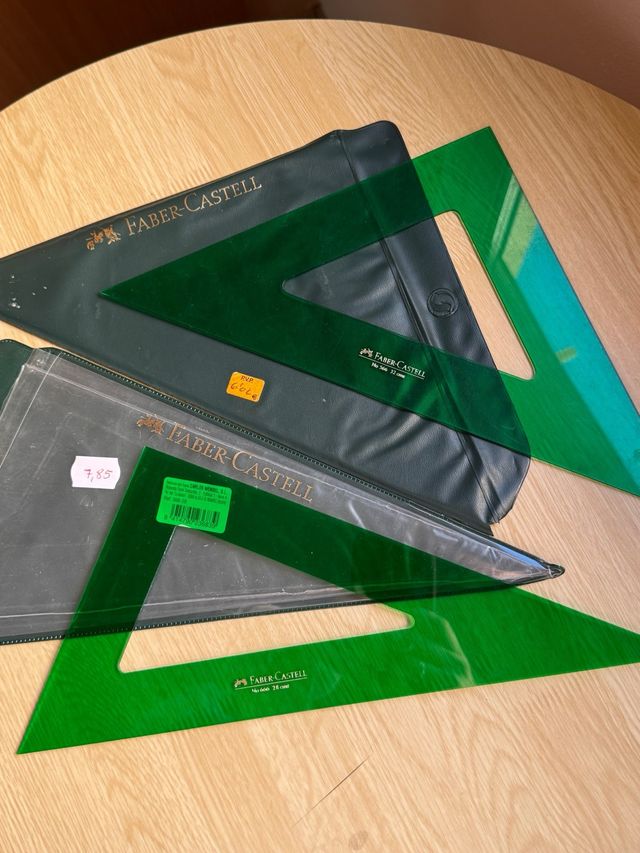 Set de escuadra y cartabón de la marca Faber Castell. - Material: Plástico verde translúcido. - Incluye funda protectora. - Tamaño 28 y 23cm