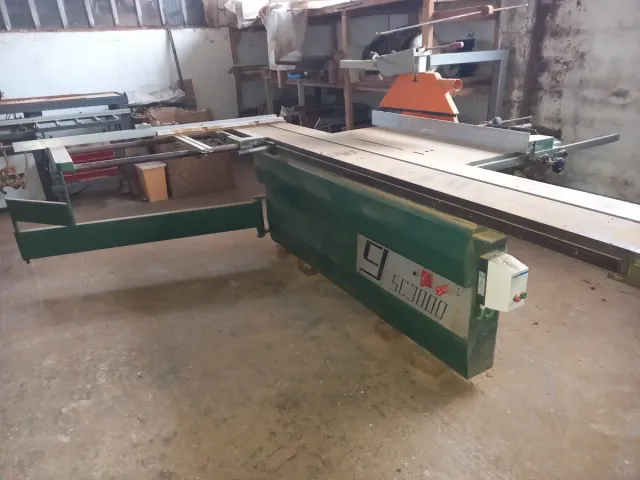 Escuadradora profesional para carpintería, modelo SC3000. - Estructura robusta de color verde. - Panel de control con interruptores. - Guía de corte extensible.