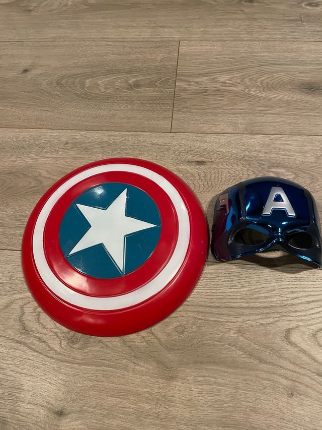 Set de escudo y máscara del Capitán América. - Escudo con diseño icónico. - Máscara azul con la 'A' característica.