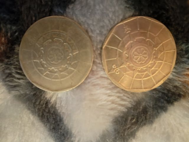 Dos escudos portugueses con diseño circular. - Diseño central floral. - Grabados exteriores. - Monedas de colección.