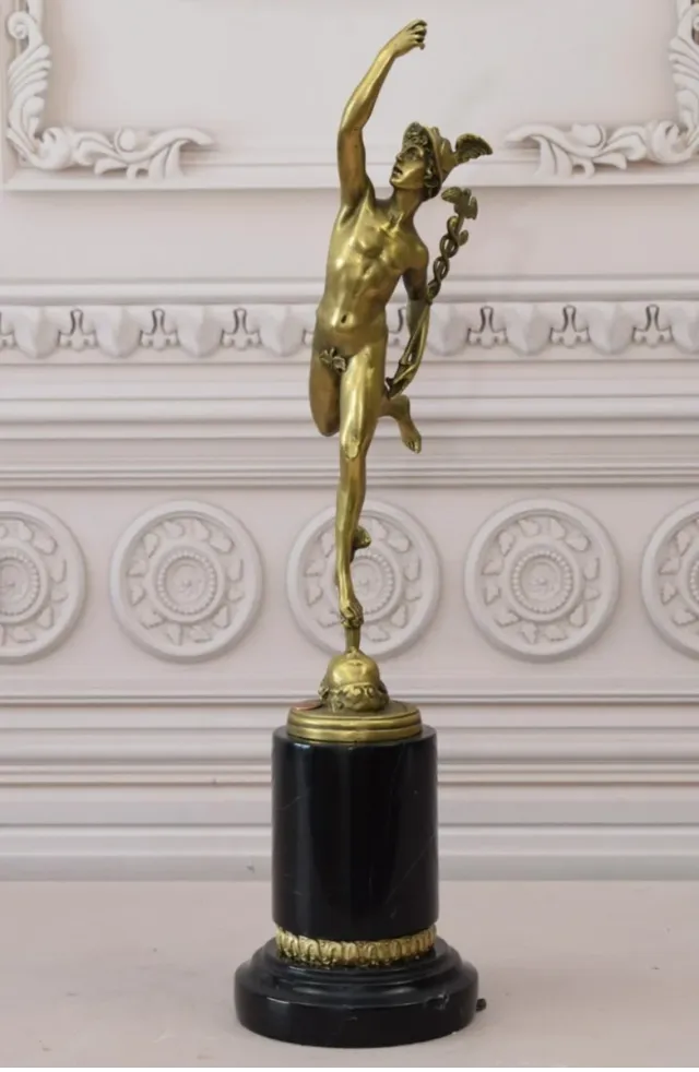 Detalles del productoEscultura de Mercurio, mensajero de los dioses y símbolo del movimiento, la elocuencia y el ingenio, representado aquí en una composición de gran dinamismo y elegancia. La figura se eleva en un gesto ascendente, capturando el instante previo al vuelo, con el cuerpo estilizado y la anatomía cuidadosamente modelada según los cánones clásicos. Con unas dimensiones de 49 cm de altura, 16 cm de ancho y 12 cm de profundidad y un peso de 3,5 kg, esta pieza posee una presencia notable. Se escuchan ofertas. Más cosas en mi perfil.