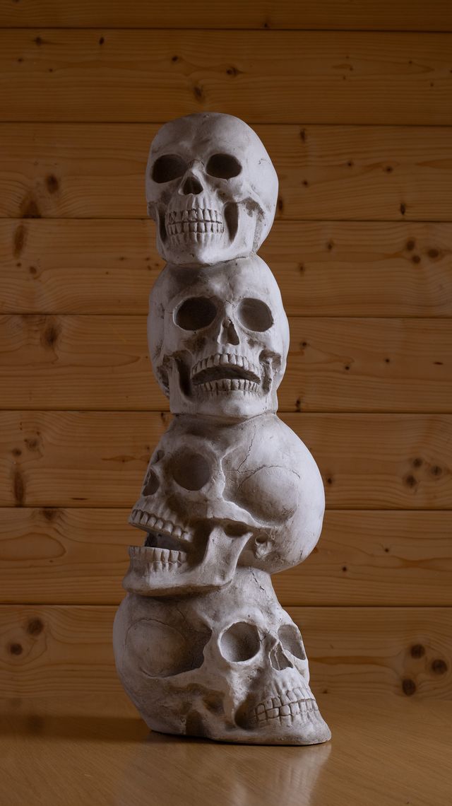 Detalles del productoApilamiento de cuatro calaveras decorativas, ideal para ambientar fiestas de Halloween o como pieza de arte gótico. 70cm de altura, peso 6kg.