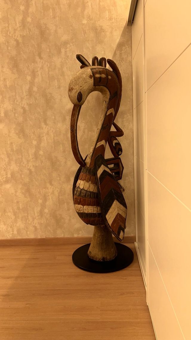 La escultura es una figura de pájaro Baga a-Bamp, también conocida como cálao o garceta, originaria de Guinea, África Occidental. Estas tallas de madera pintada tienen un significado cultural y ritual importante.