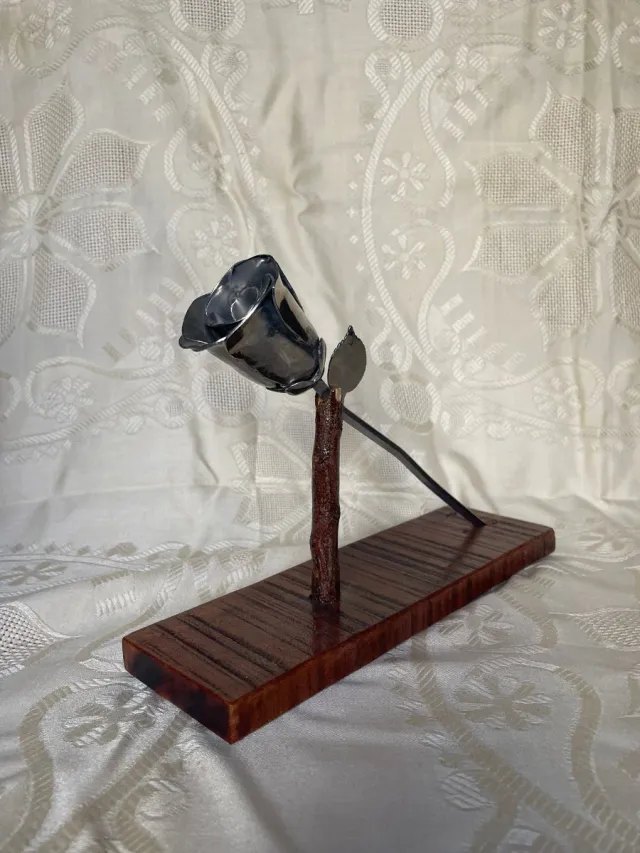 Rosa de metal hecha a mano, en acabado pulido y con una base de madera rojiza. (Precion Negociable)