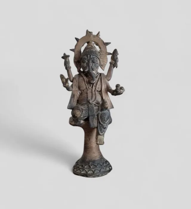 Detalles del productoFigura de Ganesha, el dios hindú de la sabiduría y los nuevos comienzos. Escultura de bronce macizo de 11 cm de altura, con múltiples brazos, halo decorativo y detalles minuciosos en el ropaje y pedestal. Posiblemente del siglo XVIII o XIX, por su pátina y estilo de fundición tradicional.