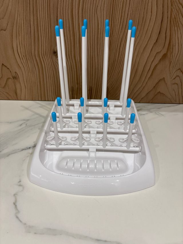 Práctico escurrebiberones para secar biberones y accesorios. - Diseño blanco con detalles en azul. - Base para recoger el agua.