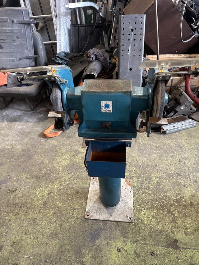 Esmeriladora doble de la marca creusen. - Color azul. - Base de soporte incluida.