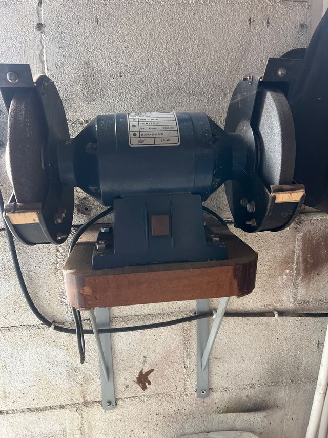 Esmeriladora profesional con dos discos. - Motor potente. - Base de madera. - Soporte metálico.