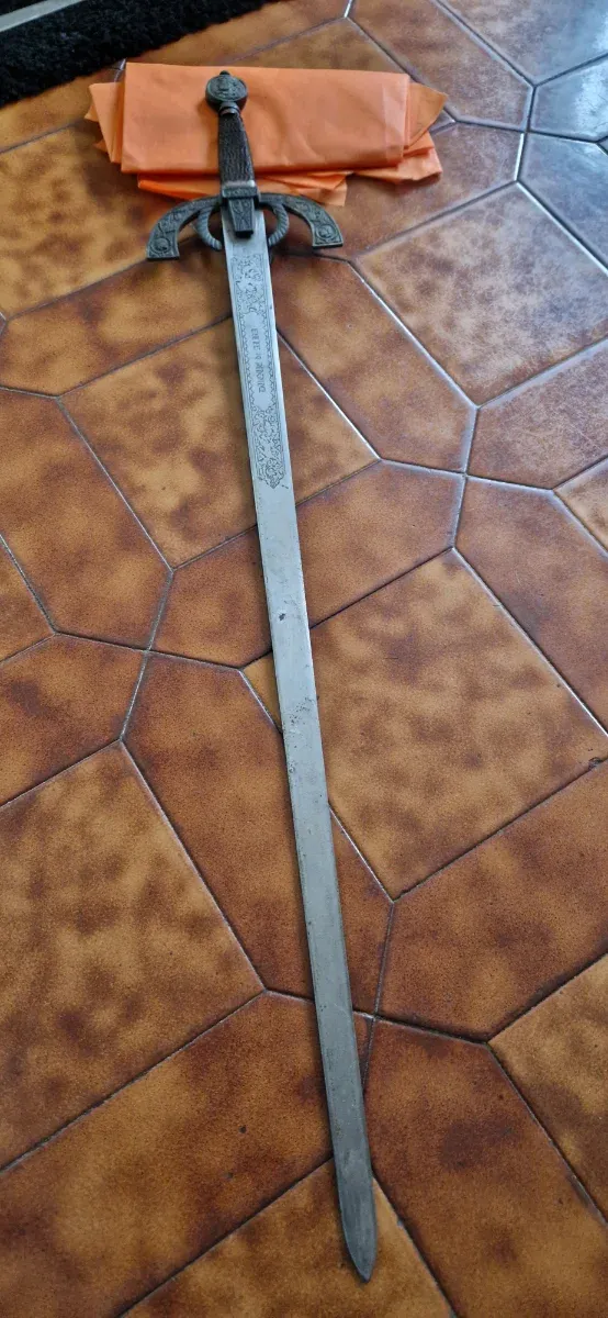 Detalles del productoEspada ornamental conmemorativa del Duque de Alba. Presenta un diseño detallado en la hoja y la empuñadura.